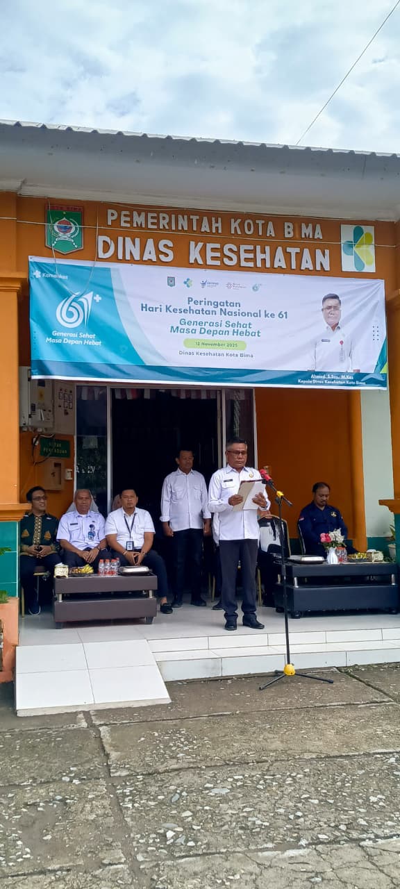 Kota Bima, Dinas Kesehatan Kota Bima melaksanakan upacara peringatan Hari Kesehahatan Nasional ( HKN ) ke-61 pada hari Rabu, 12 November 2025 di halaman kantor Dinas Kesehatan Kota bima. Upacara diikuti oleh seluruh jajaran keluarga kesehatan yaitu Direktur RSUD Kota Bima beserta jajarannya , Direktur RSAD, Direktur RSAG, Direktur RS PKU Muhammadyah, Kepala Puskesmas se kota bima, dan Organisasi kesehatan serta institusi kesehatan yang berada diwilayah kota bima. Yang menjadi pembina Upacara kepala Dinas Kesehatan Kota bima, Bapak Ahmad, S. Sos., M. Kes. Adapun Tema HKN tahun 2025 " Generasi sehat, Masa Depan Hebat".